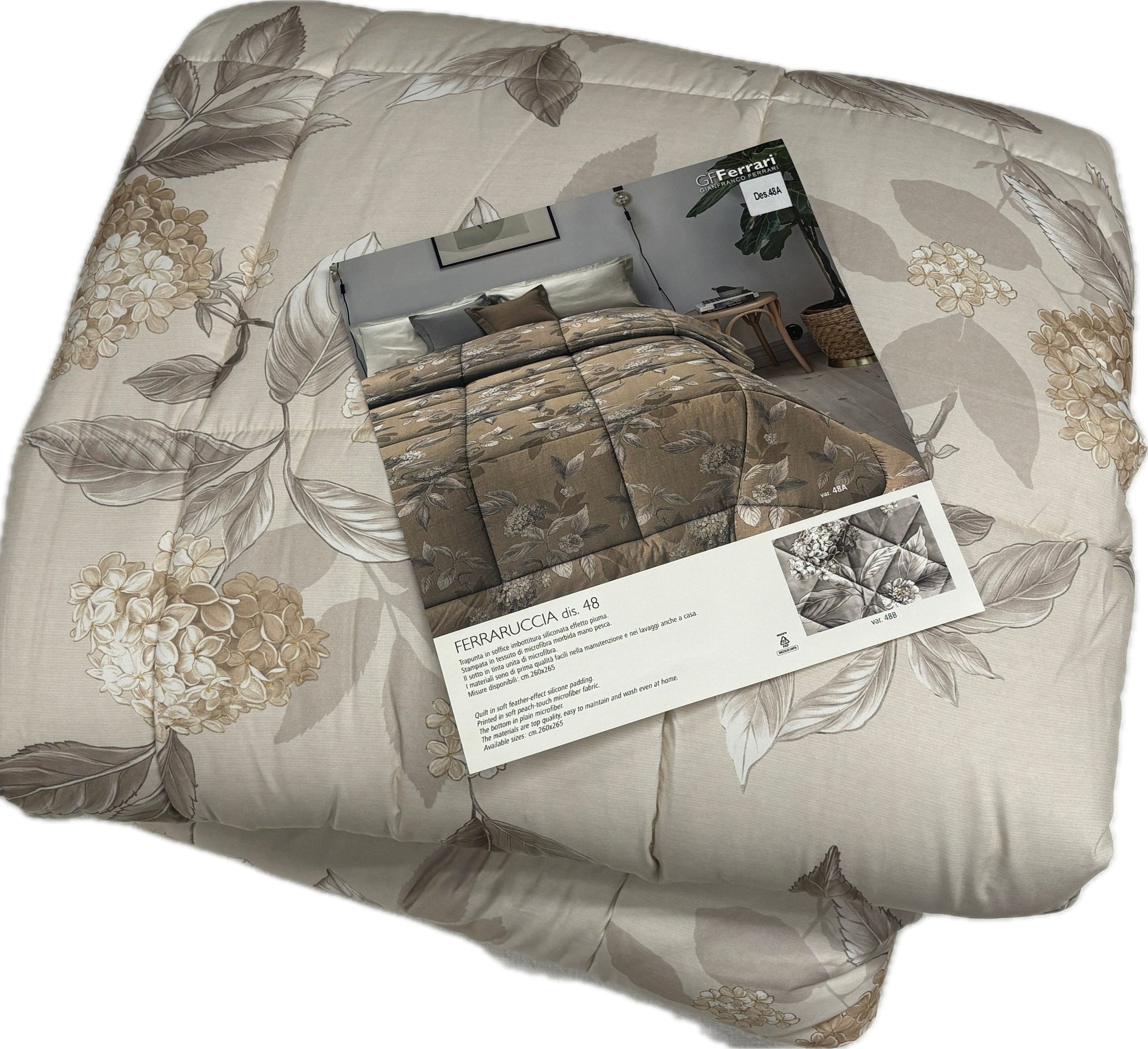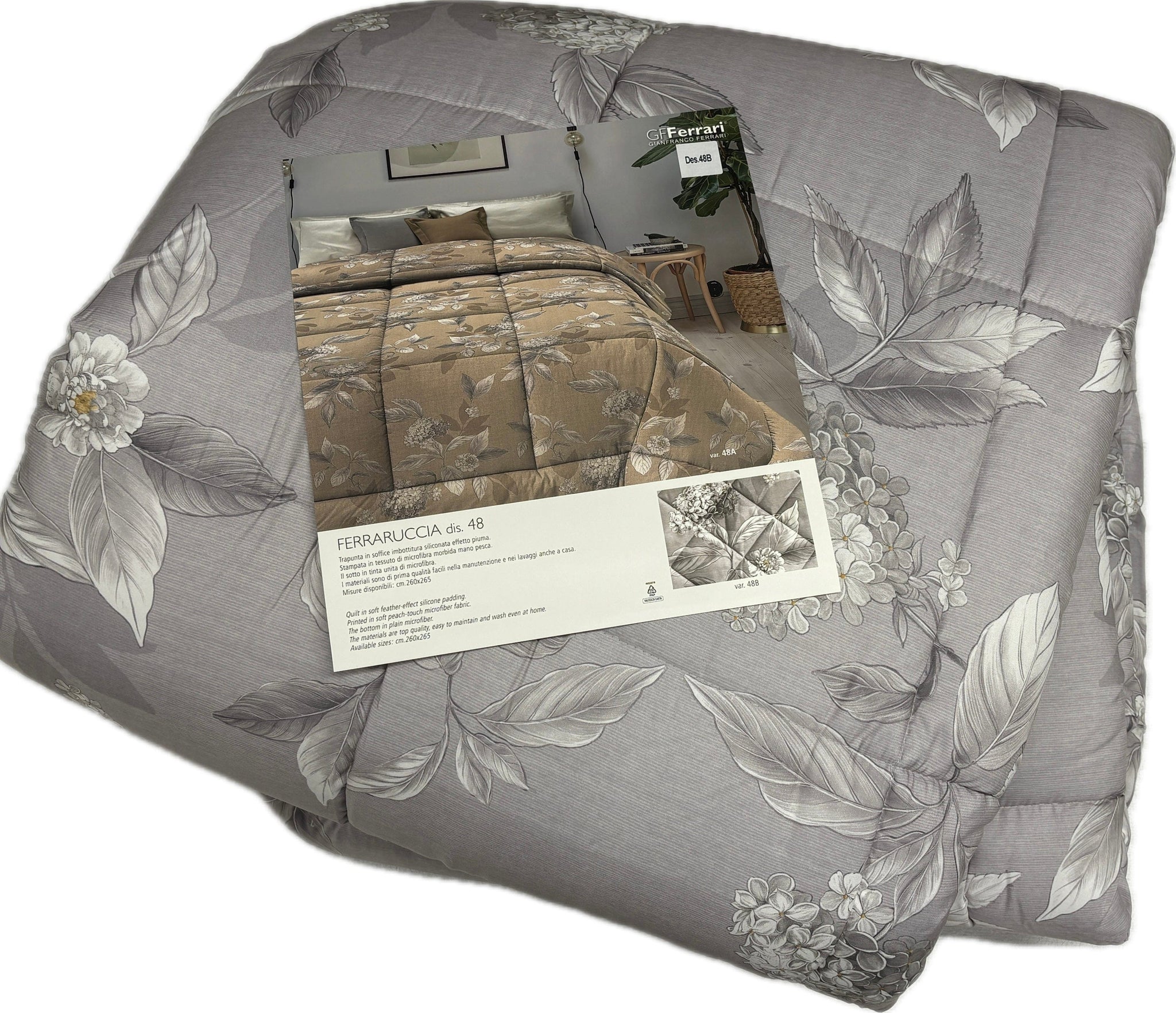 Trapunta Ferraruccia double-face con imbottitura siliconata effetto piumino e piuma come mano. Tessuto superiore è in microfibra stampata di poliestere mano pesca, tessuto inferiore è in microfibra in poliestere tinta unita anallergico. Imbottitura in poliestere di microfibra medio peso 300 gr/m2. Prodotta da GF Ferrari made in Italy. Colori così vivi e un tessuto così morbido da battere qualsiasi piuma d'oca esistente.
