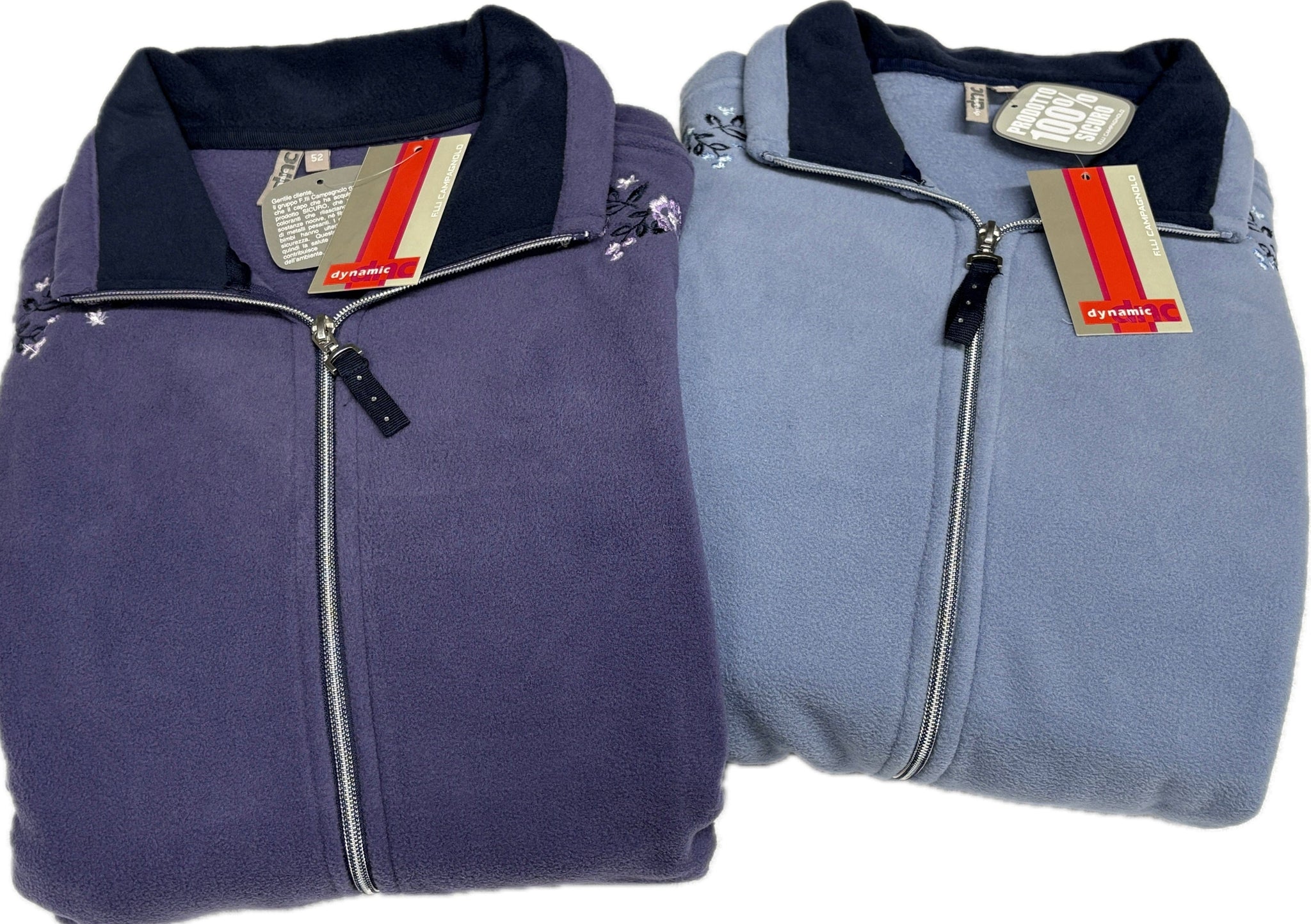 Tuta da donna di pile linea dynamic azzurra e lilla con strass fantasia fiori sulle spalle, distribuita da Fratelli Campagnolo Italia. Composizione da 100% poliestere.