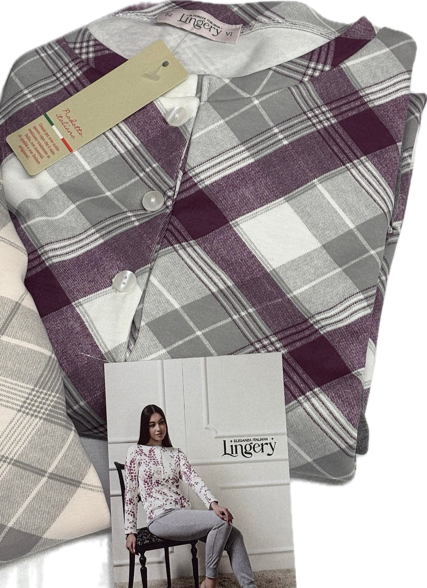 Pigiama classico da donna manica lunga, in caldo cotone 100%, prodotto da Lingery Manuela made in Italy, alta   qualità  sartoriale progettato per durare nel tempo ma sempre in linea con i trend. Profondità di taglie, comodità e attenzione ai dettagli: un prodotto pensato per tutte le donne. Il pantalone ha il fondo dritto senza polsino con comodo elastico in vita.