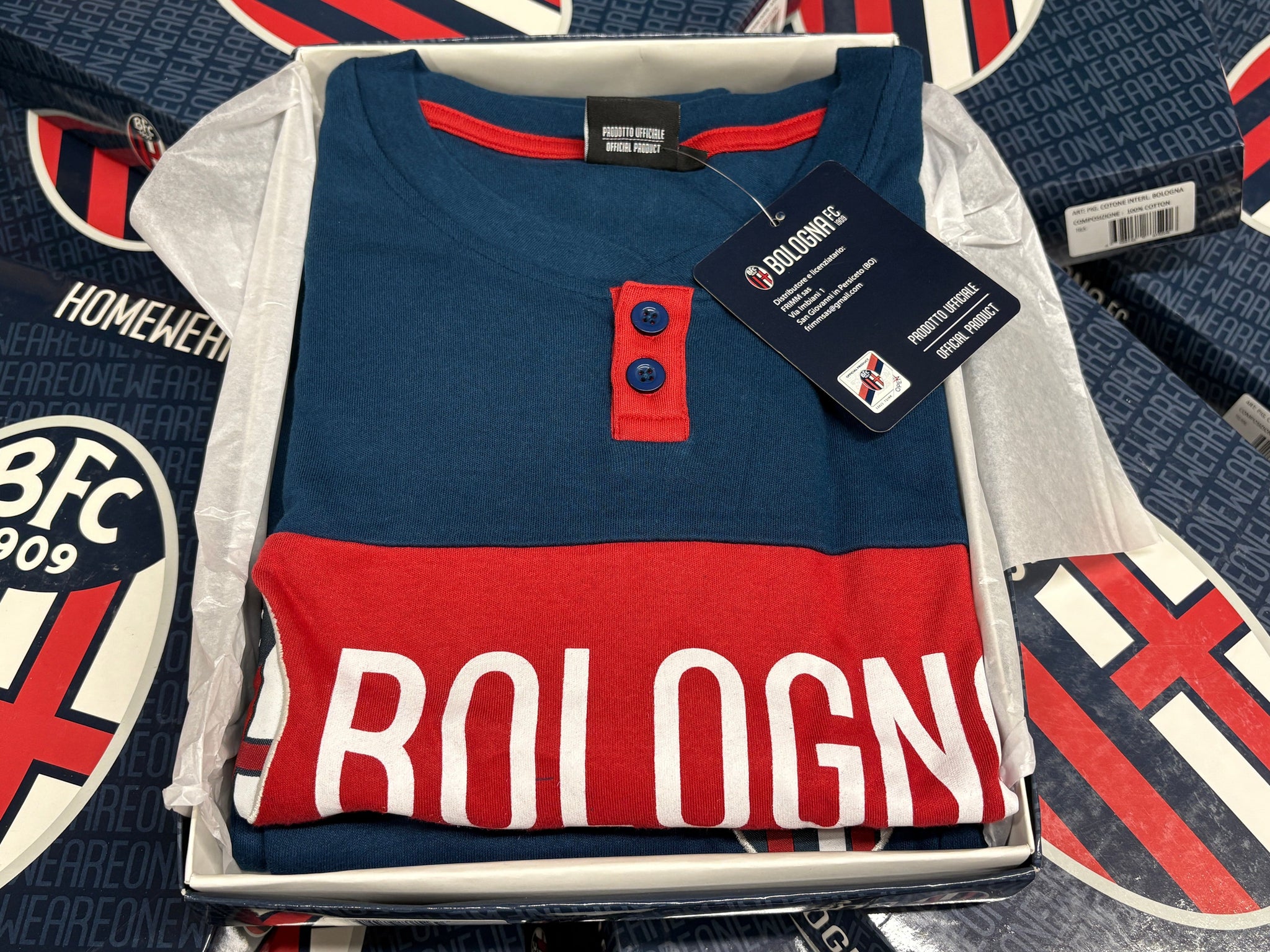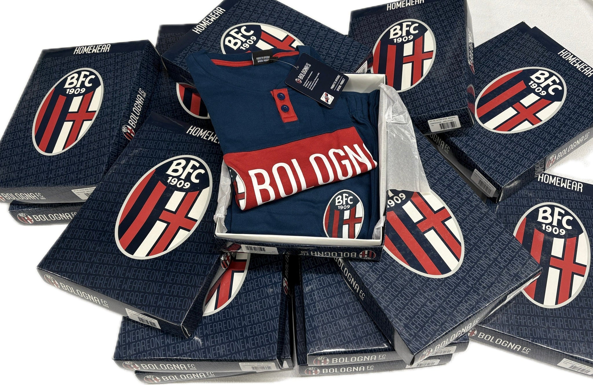 Pigiama invernale del Bologna FC 1909 Ufficiale homewear, lungo di caldo cotone 100%, due pezzi manica lunga e gamba lunga con polsino, disegnato e importato da Frimm srl. Azienda leader nelle squadre di calcio. L'attenzione al prezzo e la selezione dei materiali.