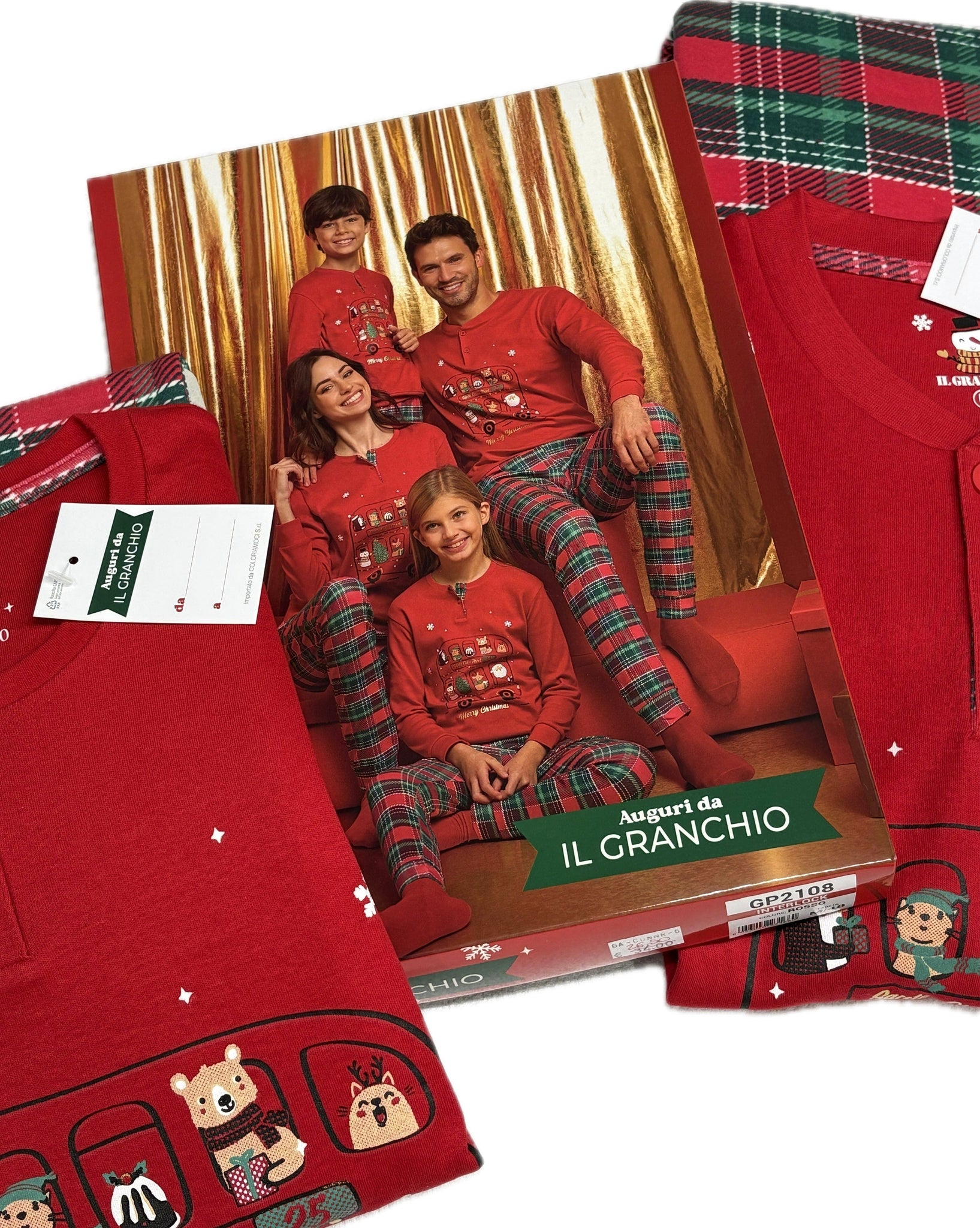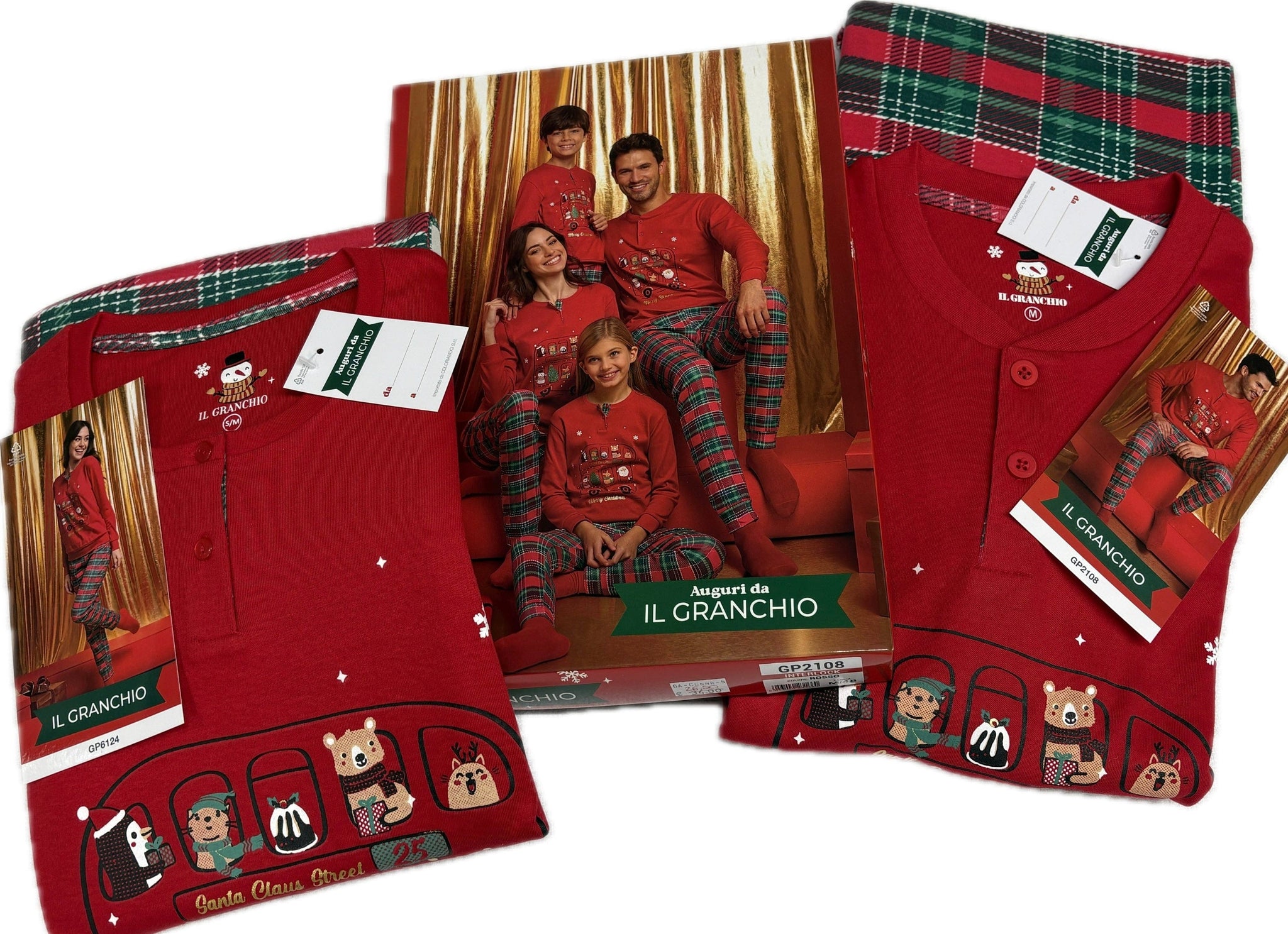 Pigiama Natalizio uomo unisex del Granchio 100% puro cotone, serafino con bottini, manica lunga e gamba lunga dritta con il polsino. Importato da coloriamoci srl, azienda Italiana. Hanno uno stile sportivo e giovane dalle linee morbide che si adattano alle forme di ogni fisicità. Casual e sportivo.