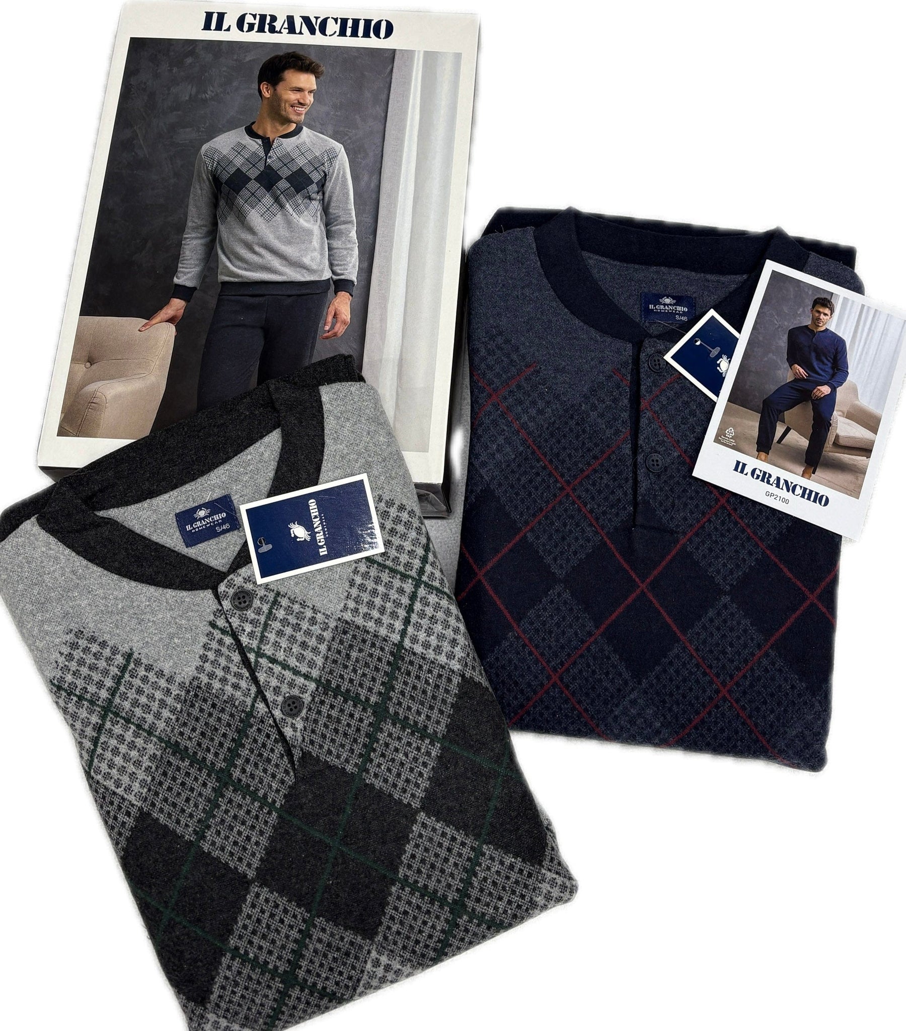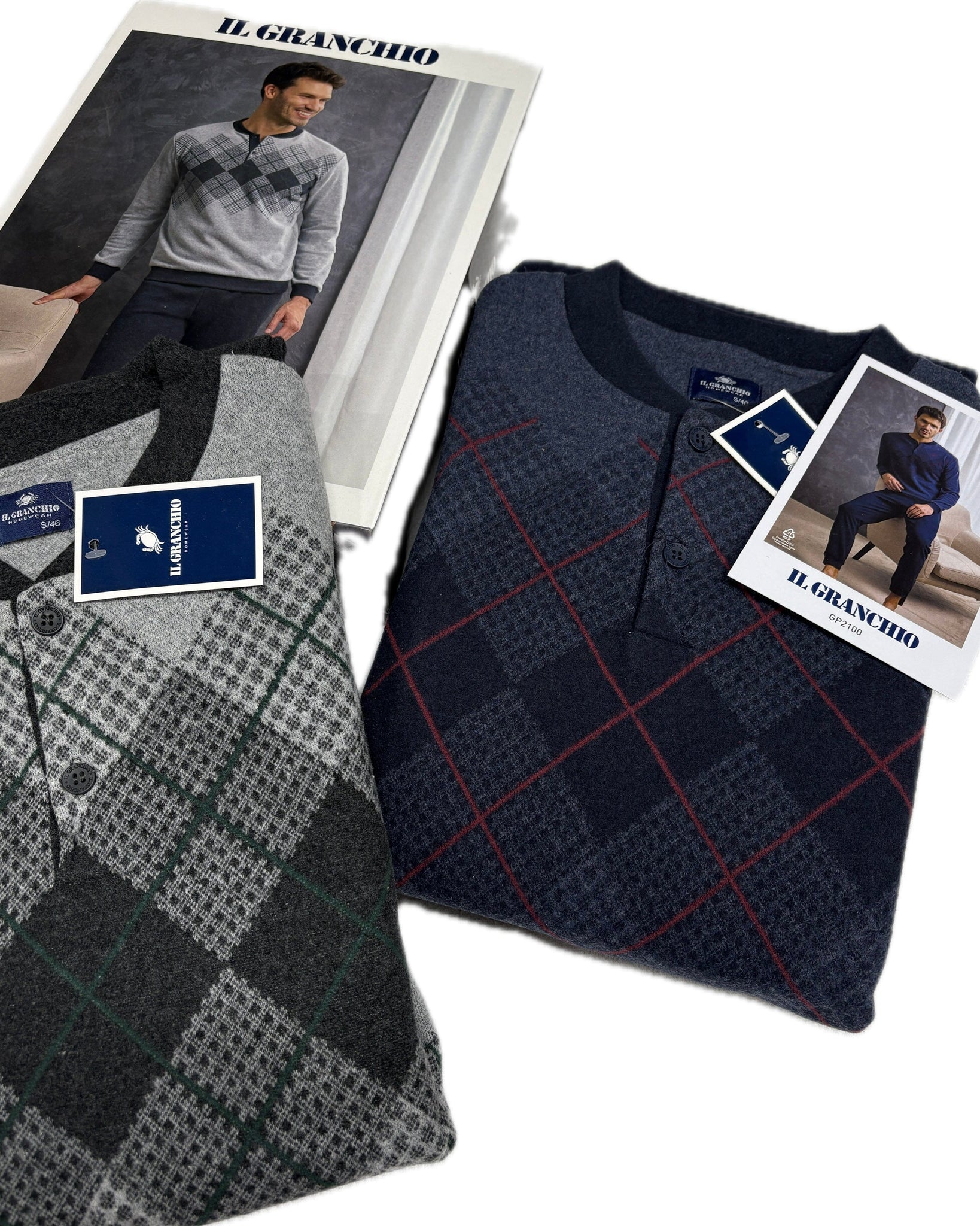 Pigiami felpati serafino da casa del Granchio Homewear manica lunga e gamba lunga con il polsino, da uomo Felpato in caldo cotone 50% e 50% poliestere, importato da Coloriamoc srl (BT) Italy, non inseguire la qualità indossala. Vestibilità italiana, taglie comode, la maglia è a serafino, un classico molto comodo.