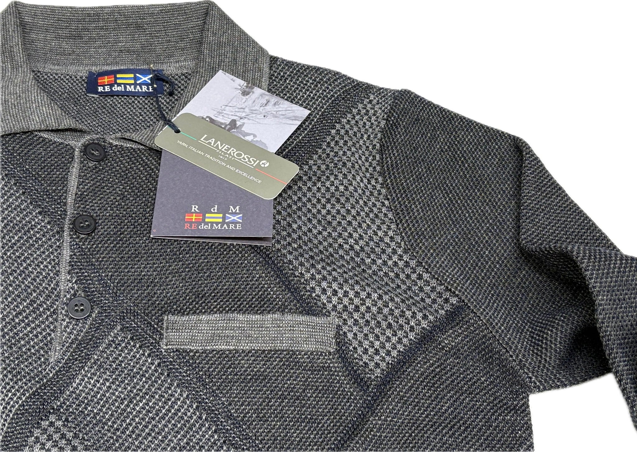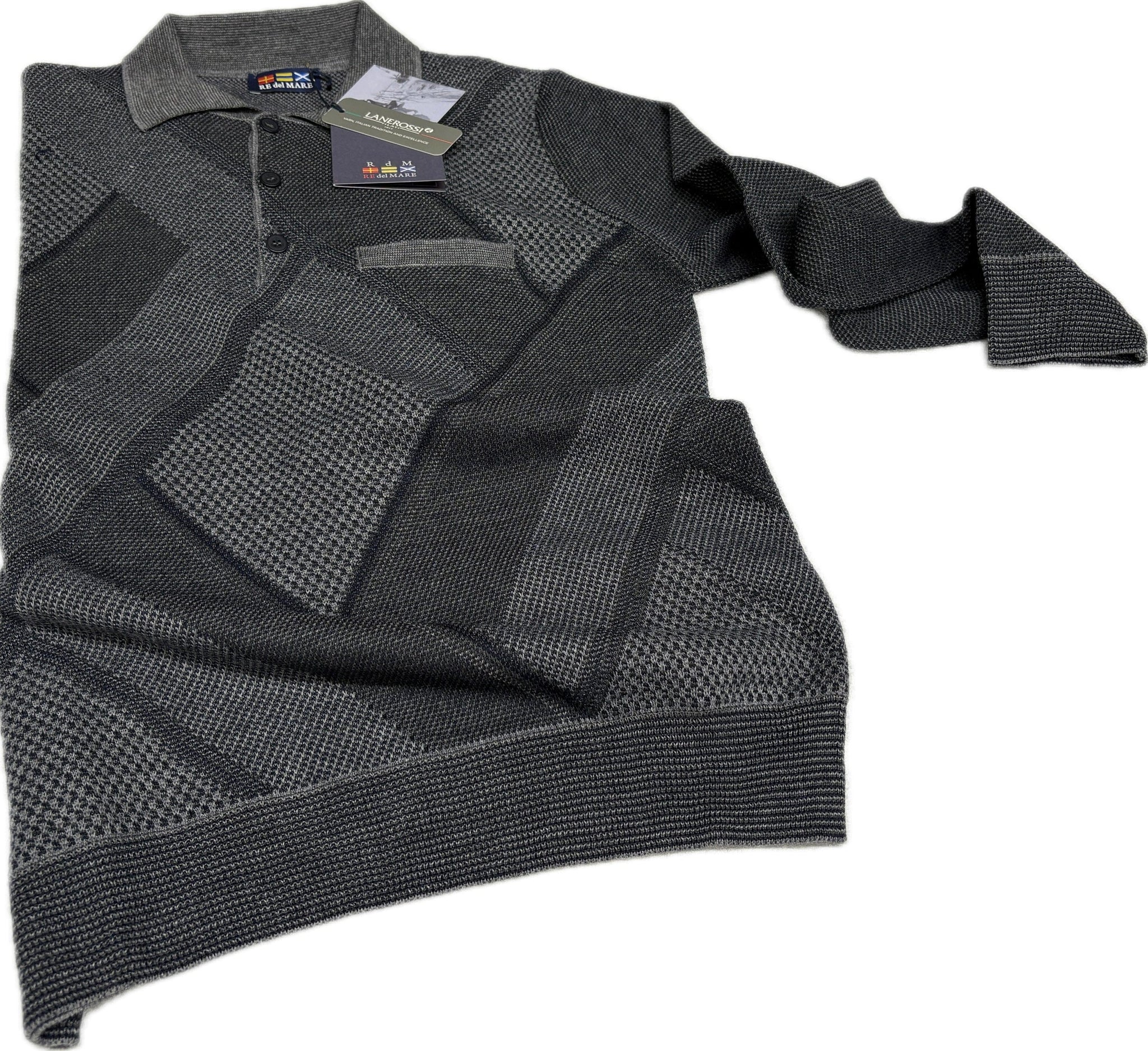 Polo uomo tre bottoni con taschino manica lunga mistolana, composizione 50% lana rossi e 50% acrilico. Fantasia rombi tinta su titan elegante classica con taschino sul cuore, prodotta dal Maglificio Rodes, fondato nel 1961, e per più di quarant'anni ha mantenuto la propria sede commerciale e amministrativa a Campi Bisenzio in provincia di Firenze, particolare attenzione merita il total look della linea RE DEL MARE, decisamente attenta alla qualità, risponde alle esigenze del vestire sportivo ma raffinato, con un'offerta completa di articoli per uomo: maglie, camicie, pantaloni, polo e accessori.