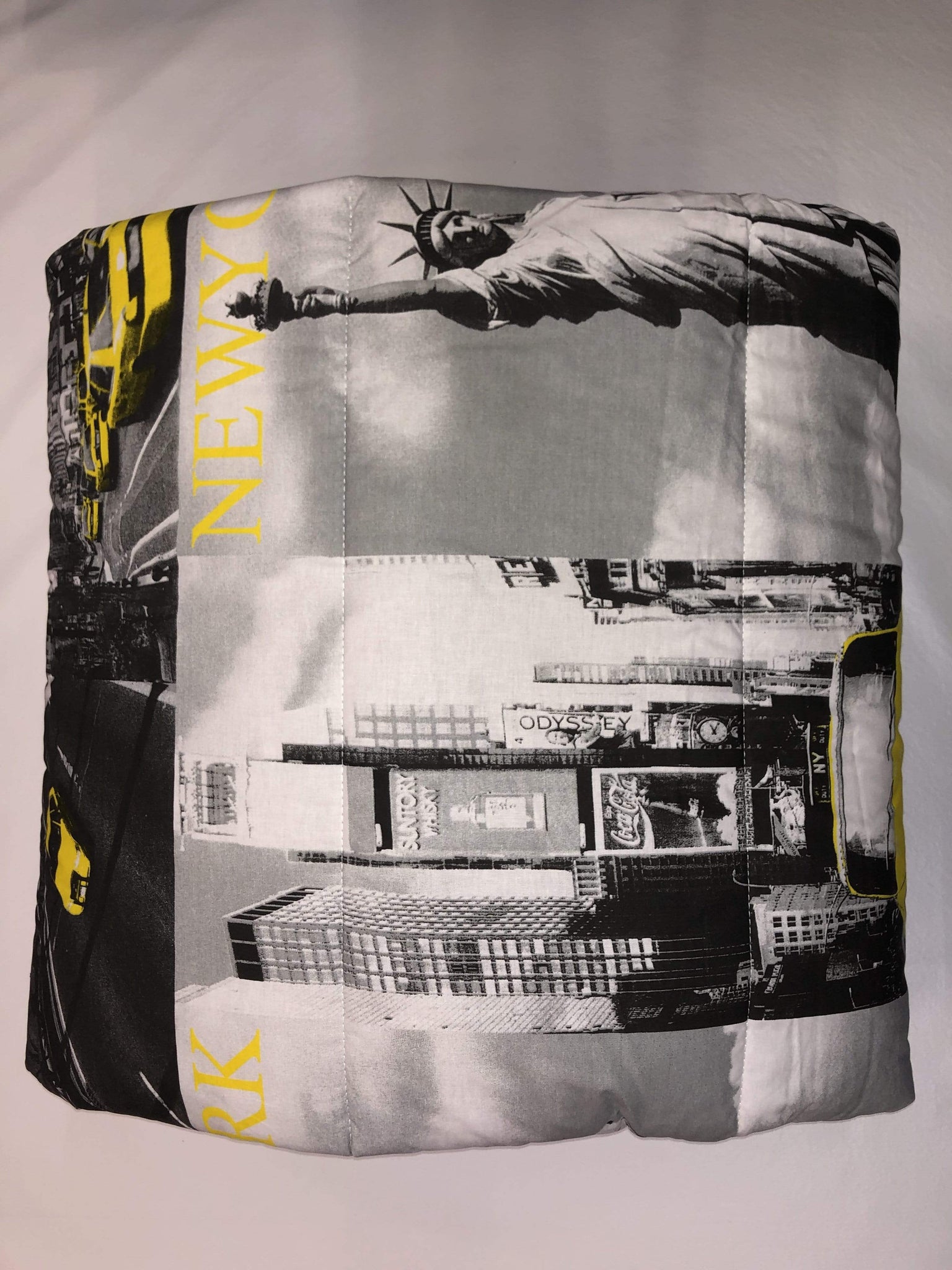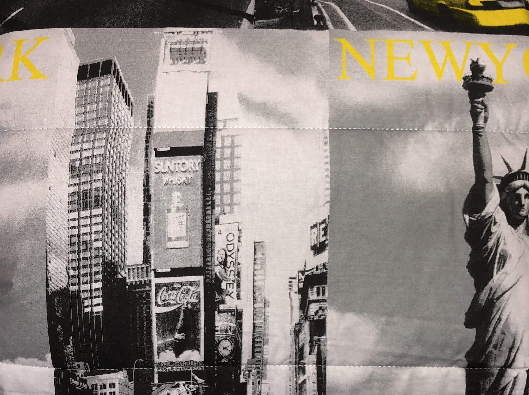 Trapunta New York prodotto made in Italy da Onda Blu, passione per la casa. Colori solidi e vivi sono mescolati in un armonia di disegni perfetti per rappresentare la città di New York. Tessuto esterno in pura microfibra 100%, imbottitura 100% poliestere anallergico 350 gr/mq, sopra c'è la fantasia della città mentre sotto è tinta unita giallo intenso.